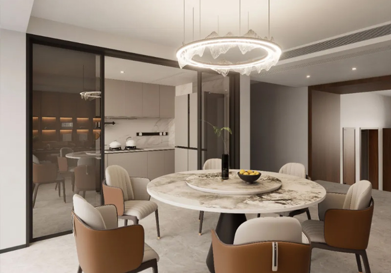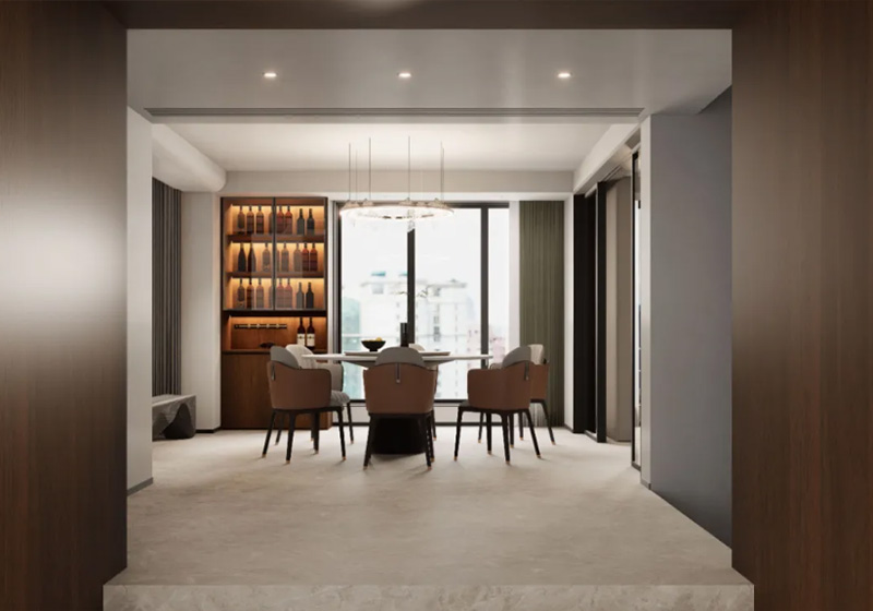 餐廳精心打造成一處融合古典韻味與現(xiàn)代雅致的空間,毗鄰廚房與茶室,是連接各個空間的樞紐,亦是日常用餐、社交聚會的重要區(qū)域。桌椅的顏色與曲線造型皆與護(hù)墻呼應(yīng),帶來流線感的同時,增強了整體的溫馨氛圍。